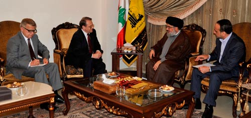 Hizbullah Secretary General His Eminence Sayyed Hassan Nasrallah received on Saturday the Russian deputy Foreign Minister Mikhail Bogdanov and the Russian Ambassador to Lebanon Alexander Zasypkin, in the presence of the Head of Hizbullah's International Relations, Sayyed Ammar Moussawi.